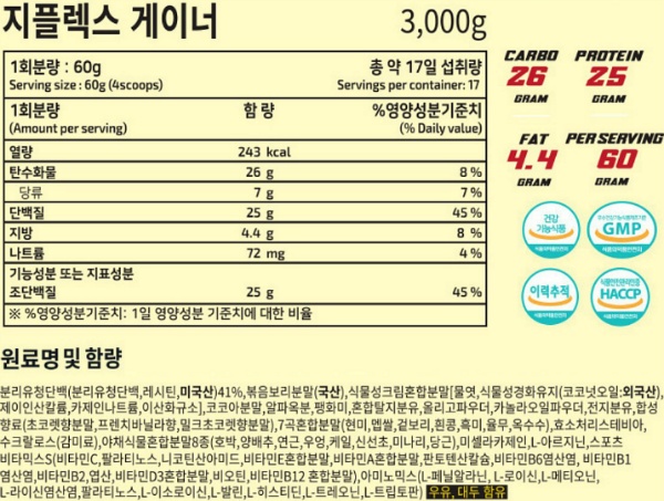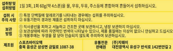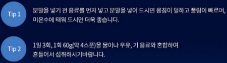 1일 3회, 1회 60g(4스푼)을 물, 우유, 두유, 주스등에 혼합하여 흔들어서 섭취하십시오.