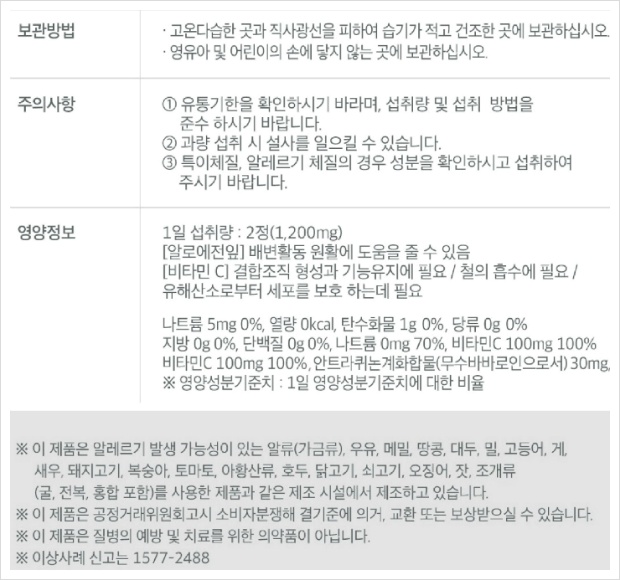 1일 1회, 1회 2정 (1,200mg) 섭취하십시오