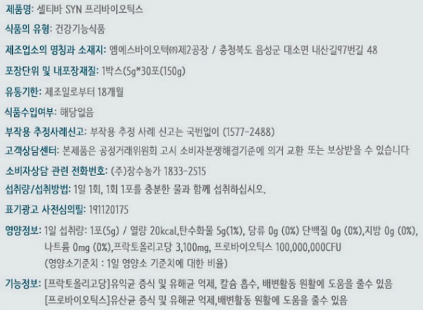 < 셀티바 신 SYN 프리바이오틱스 등록정보 >