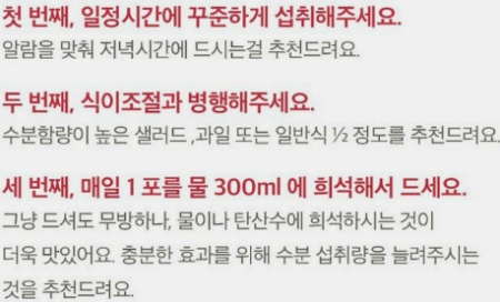 1. 유통기한을 확인하시기 바라며, 섭취량 및 섭취방법을 준수하시기 바랍니다.