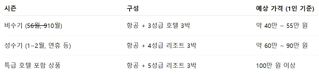 항공사(수하물 포함 여부), 리조트 위치, 식사 포함 여부에 따라 금액 차이 큼