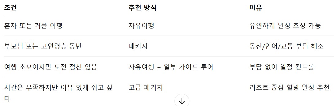 • ✅ 자유여행 vs 패키지 여행 장단점
