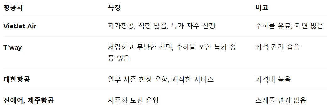 • 직항 노선은 항공사에 따라 수하물 규정이 다르니 반드시 확인(비엣젯 항공은 수하물 미포함 특가가 많음)