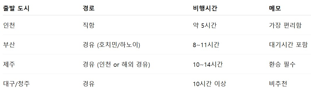 직항이 가장 빠르고 편리하지만, 성수기나 가격 조건에 따라 호치민, 하노이, 다낭 등을 경유하는 노선을 선택하는 경우도 있습니다.